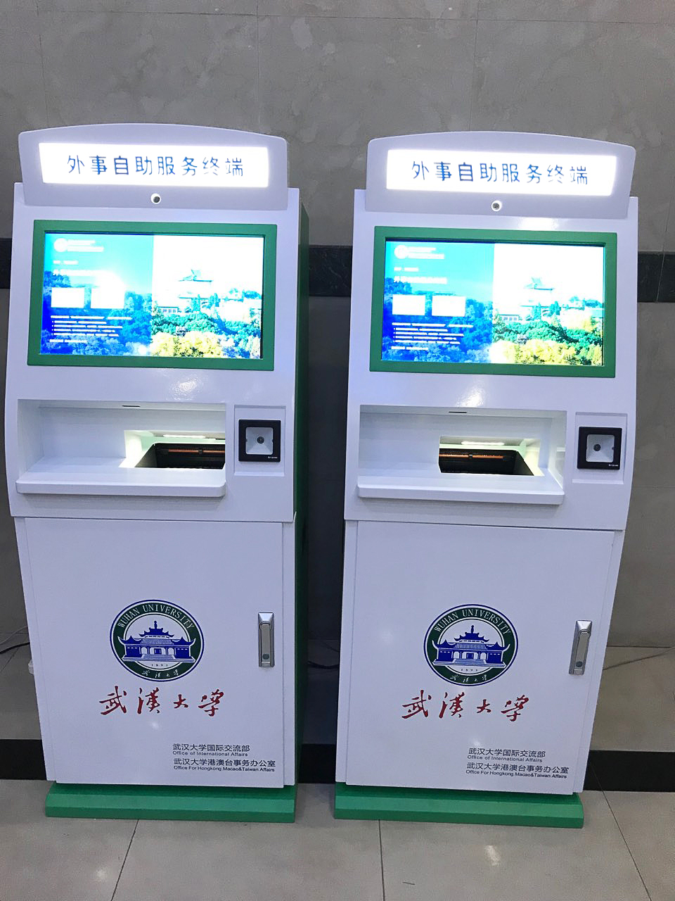 2018年11月28日,武汉大学因公出国(境)综合服务管理系统上线后得到了全校师生的一致好评。后续为方便教职工办理因公临时出国(境)业务手续,我司再接再厉,与校方合作推出自助服务打印终端,教职工可在各终端打印批件及人员申请表用于财务报销或请款。现5台终端已在学校医学部8号楼1楼大厅、文理学部国际交流部1楼和综合事务服务中心(当代楼)1楼以及信息学部国际交流服务中心1楼率先投入使用,后期2台自助服务打印终端于今年7月底完成在口腔及人民医院安装及调试工作。