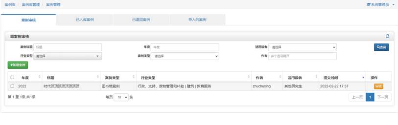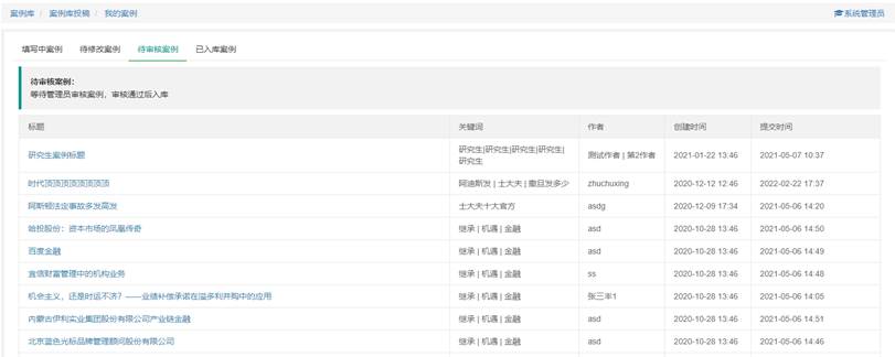 案例管理包括管理员案例管理和投稿用户个人案例管理。案例管理员管理所有系统中的案例,包括审核投稿的案例,已入库的案例上下架,批量导入案例和案例附件。个人案例管理可以修改个人未提交或者被退后案例,查看个人已入库的投稿案例。