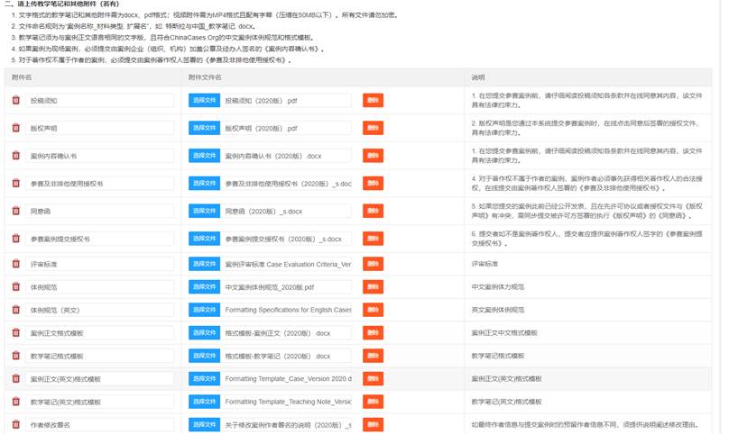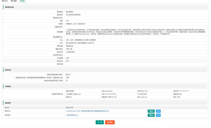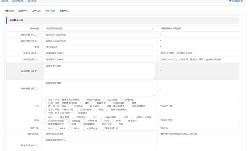 在线投稿模块包括投稿政策版权声明须知、基本案例正文和案例相关附件的上传、案例基本信息和作者信息填写确认提交。
