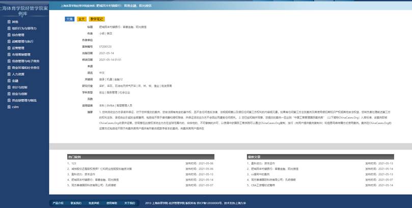 我司为上海体育大学经济管理学院定制开发的案例库系统,包括“案例库前台网站”、“案例在线预览”、“案例在线投稿”、“案例管理”、“个人案例管理”、“其他基础信息管理”。