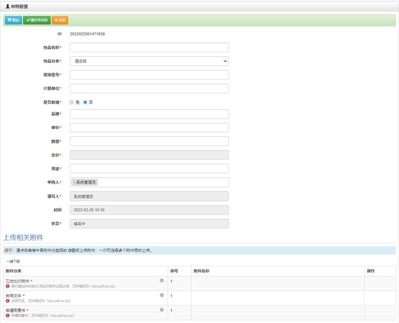 所有成员都可以进行申购,根据个人或者公共需求进行申购,申购时会对额度的设置进行校验,然后提交到管理员处进行审核,通过之后即可进行入库。