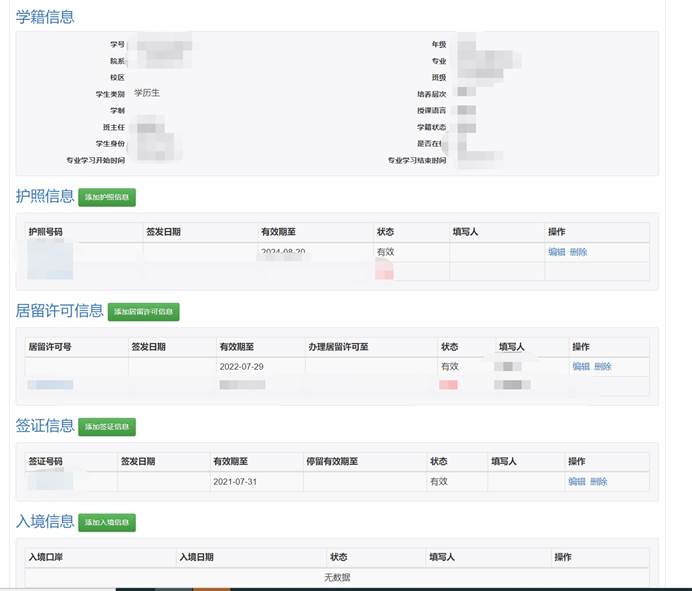国际学生证件模块可以对学生的证件(护照、签证、居留许可)信息进行维护,可以对即将到期的证件进行提前告警、可以导出相关表格:居留许可手续函、签证申请(停留证件、居留证件)。
