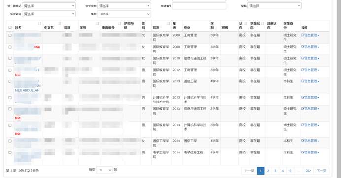 我司为西安电子科技大学定制开发的国际学生管理服务平台,包括“国际学生招生录取管理”、“国际学生迎新管理”、“国际学生学工管理”、“国际学生证件管理”、“国际学生住宿管理”、“国际学生开具证明管理”、“系统管理”等模块。