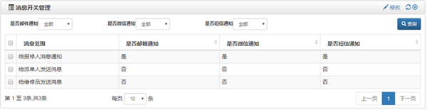 系统在各个环节都有邮件、微信或者短信通知,用户没登录系统时也能及时了解预约情况;提交报修单后,系统可给派单人发送邮件、微信或者短信通知, 提醒派单;派单通过或退回后,系统可给维修服务人员及报修人发送邮件、微信或者短信告知派单结果。