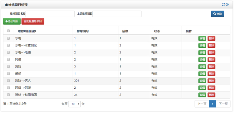 建立维修项目信息,便于按不同维修项目指派不同的维修人,维修项目可分多级,比如第一级分成:水、电、木、泥、油漆、金属、室外、暖气、网络等,第一级水又可以分成水龙头、水管、阀门等二级项目。