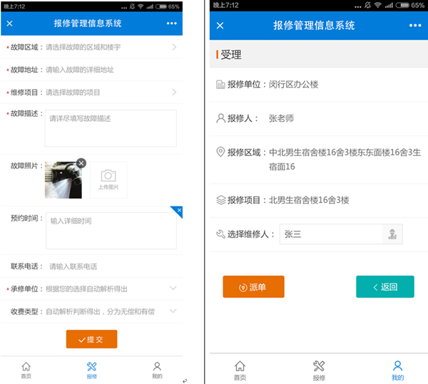 维修分:无偿、有偿,管理员可设置维修区域、维修项目的收费类型,未设置的默认为无偿。用户报修时可以看到是免费维修还是收费维修。收费维修时,维修完成后可录入收费情况。