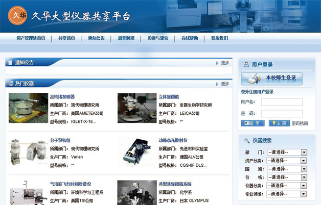 提供仪器信息对外展示的网站,无需登录即可查看学校对外共享的仪器信息;可展示仪器共享相关的通知公告、规章制度等信息;校外人员注册后可以预约仪器,提供用户意见反馈机制。