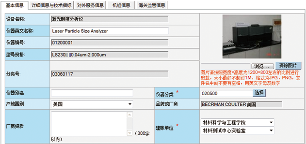 可设置查询条件,从资产系统导入大型仪器基本信息;导入后需补充仪器技术参数、照片、收费标准等数据,可由校级管理员、学院管理员、仪器负责人三级管理,仪器信息补充完整并经审核后才可被预约。