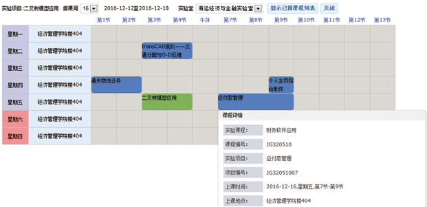 系统以可视化界面进行实验排课,可在课表上方便的选择周次、节次、实验室,安排上课班级、指导教师。